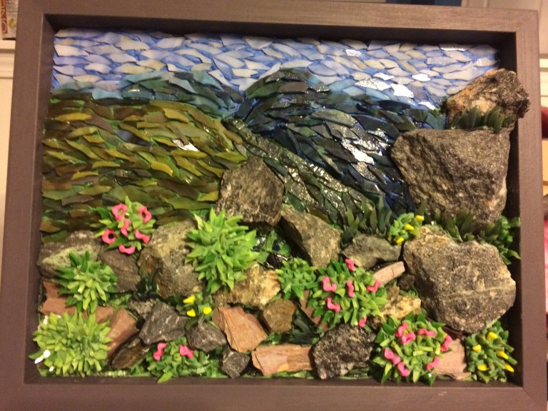 Another change to my mosaic art came after taking a class from Laura Rendlen. Laura opened my eyes to the possibility of making my mosaics 3D. I have begun to incorporate different types of tesserae into my work to give it texture and dimension. Creating landscapes and garden pieces in a 3D format allows me to incorporate so many different types of things into my work. I love using shells, rocks, bottle caps, beads, wire, hardware, whatever sparks my creativity.