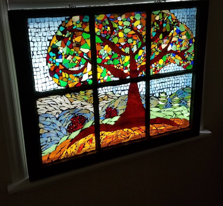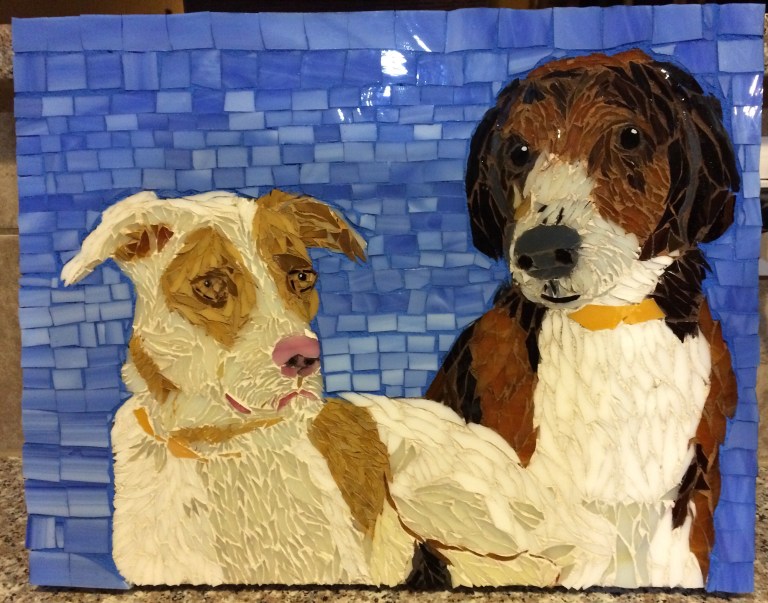 I recently completed this pet portrait of 2 of my favorite dogs. Chase, the Beagle/Basset Mix, was the soulmate of our Shepherd mix Jezebel. Chase and Jezebel spent many years running and playing together. Sadly both of them have now crossed the rainbow bridge. Now, Fred has a new love Charlotte. Charlotte is the beauty in the foreground of this portrait. We no longer live across the street from each other but Charlotte comes to stay with us often and she and our Millie are now soul sisters. I love seeing the second generation of best dog buddies. Fred’s mother commissioned this portrait of Chase and Charlotte for Fred’s birthday. What joy it brought me to bring these 2 loves of mine to life in glass.