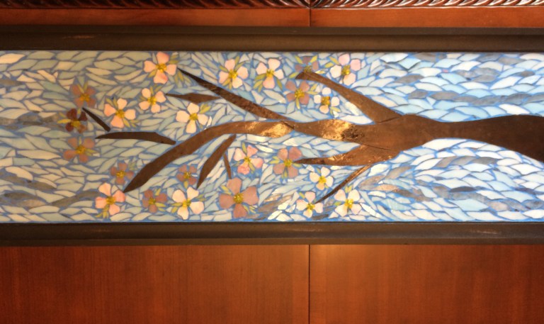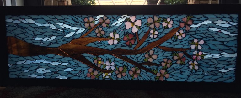 Here is another fun piece that I made for another mom. She is going to hang this above her kitchen bar between the kitchen and the family room. I worked with her son and granddaughter to come up with a pink dogwood branch. This piece is 12 inches high by 36 inches long.